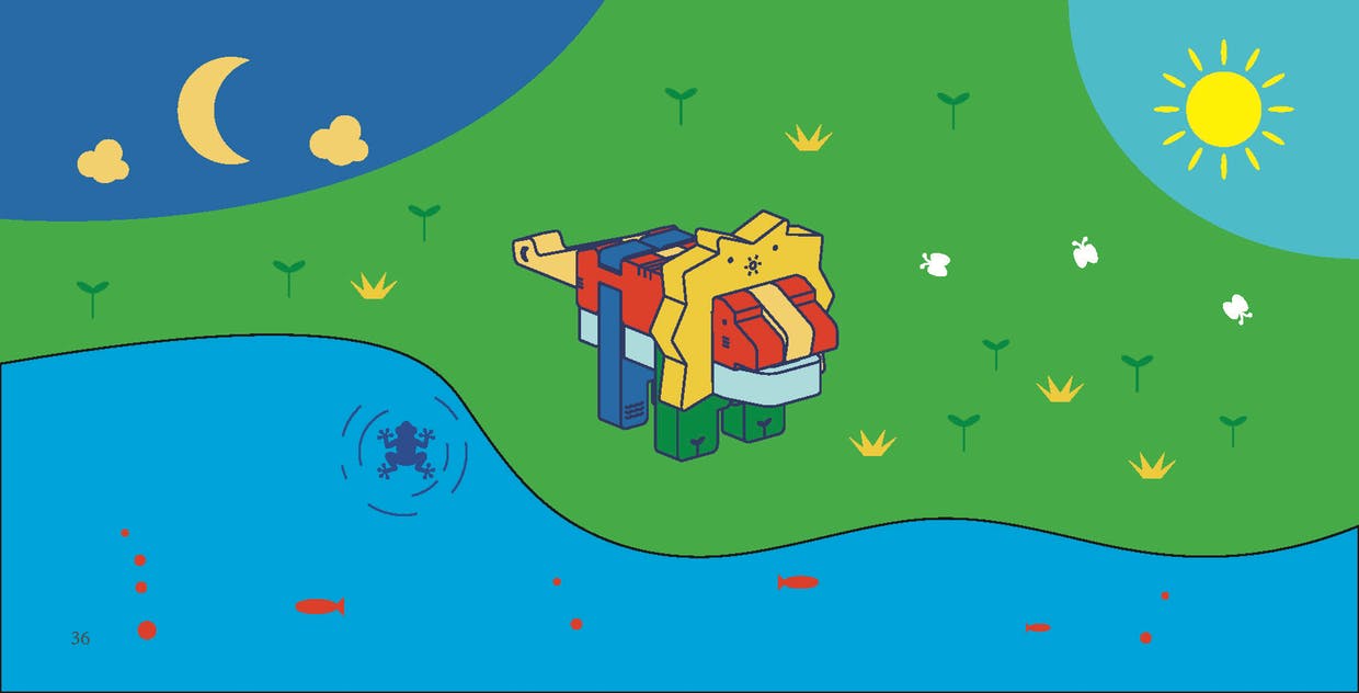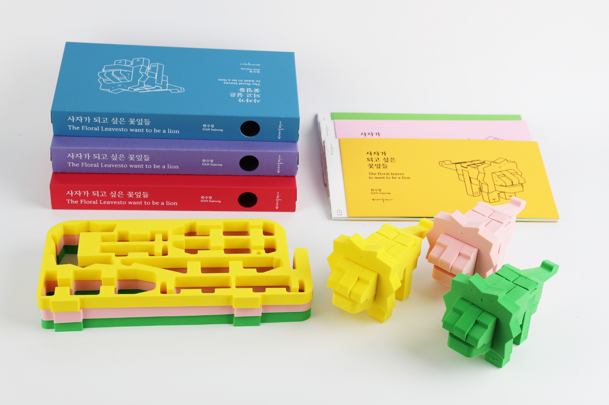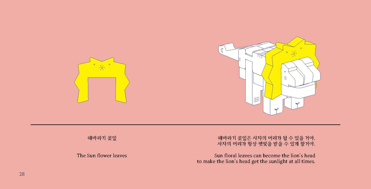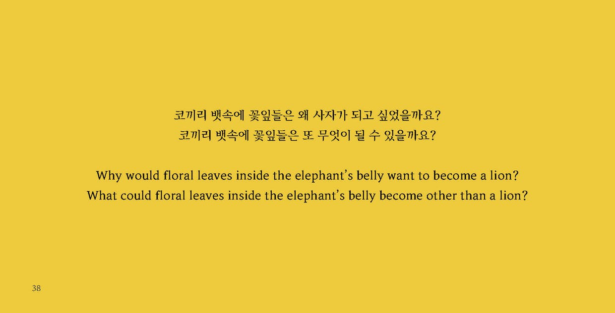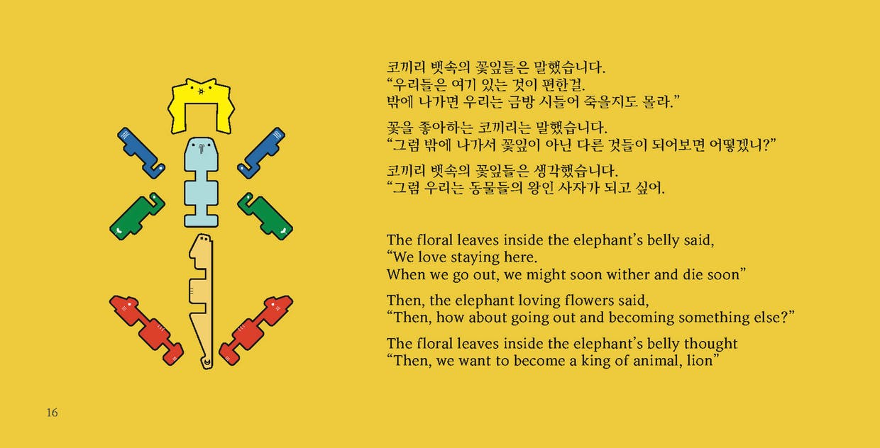 Elephants who like floral leaves appear in the story book. The elephant ate floral leaves related to various places such as the wind, moon, field, river, sea and sea. The floral leaves in the elephant's inside wonder what they would become. In the end, they decided to combine all their abilities to become the animal king, lion. Wind floral leave became the lion's body, moon floral leave became the lion's head and tail, wild floral leave became the lion's forefoot, water floral leave became the lion's hind legs, sea flower became the lion's face, and sunflower leave became the lion’s head. Filially, they became a lion made of flowers. This lion is happy to get around various places such as wind, moon, field, river, sea and sea. The story does not end here, but ends with asking the last question: “Why do floral leaves want to be a lion?”, “What could floral leaves inside the elephant’s belly become other than a lion with combining their abilities?”. The answer is yours.