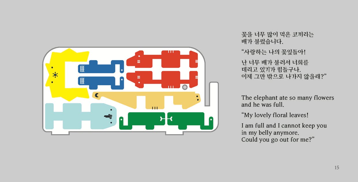 꽃을 너무 많이 먹은 코끼리는 배가 불렀습니다. “사랑하는 나의 꽃 잎들아! 난 너무 배가 불러서 너희를 데리고 있기가 힘들구나. 이제 그만 밖으로 나가지 않을래?”