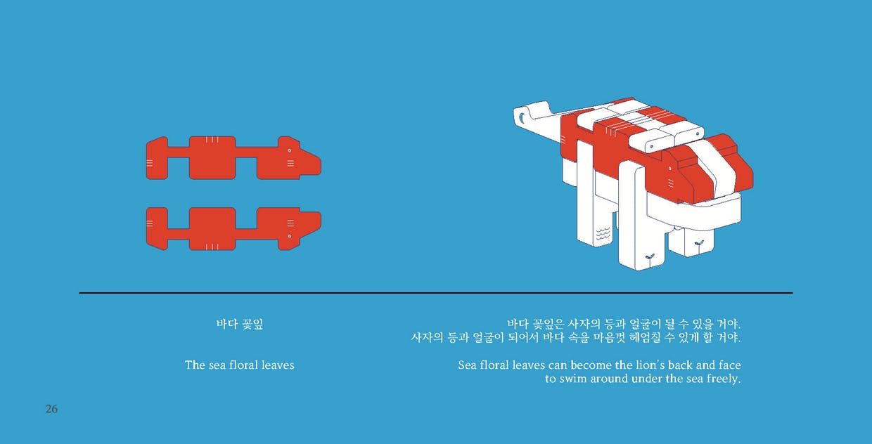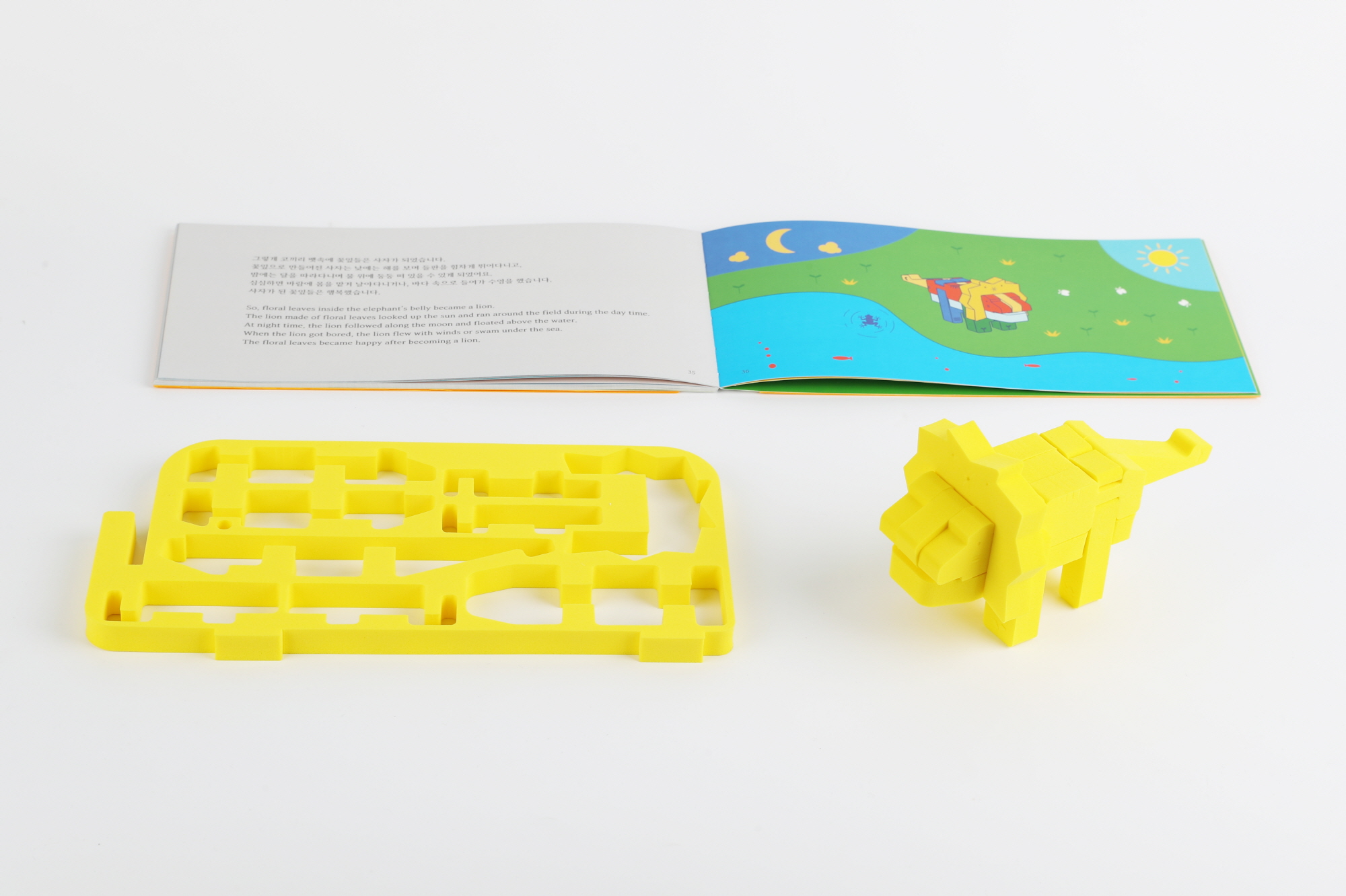 Elephants who like floral leaves appear in the story book. The elephant ate floral leaves related to various places such as the wind, moon, field, river, sea and sea. The floral leaves in the elephant's inside wonder what they would become. In the end, they decided to combine all their abilities to become the animal king, lion. Wind floral leave became the lion's body, moon floral leave became the lion's head and tail, wild floral leave became the lion's forefoot, water floral leave became the lion's hind legs, sea flower became the lion's face, and sunflower leave became the lion’s head. Filially, they became a lion made of flowers. This lion is happy to get around various places such as wind, moon, field, river, sea and sea. The story does not end here, but ends with asking the last question: “Why do floral leaves want to be a lion?”, “What could floral leaves inside the elephant’s belly become other than a lion with combining their abilities?”. The answer is yours.