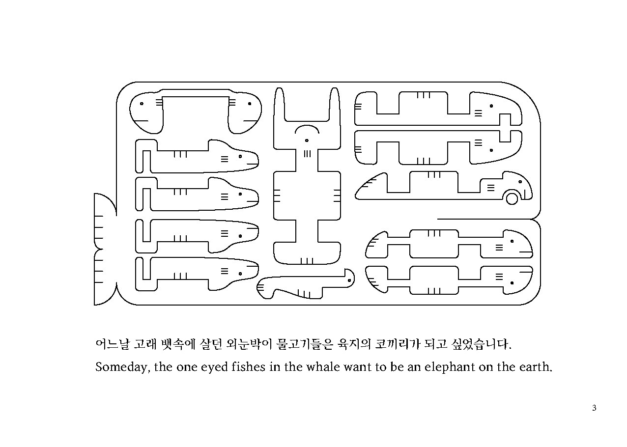 코끼리가 되고 싶은 외눈박이 물고기' 동화책은 고래 뱃속에 살던 외눈박이 물고기들이 코끼리가 되어가는 과정을 이야기합니다. 외눈박이 물고기들은 각자의 특성들을 살려서 코끼리의 일부가 됩니다. 바닥넙치는 코끼리의 배와 상아로, 꼬리날개해마는 코끼리의 코로, 푸르릉 고등어는 코끼리의 옆구리와 얼굴로, 구부렁 장어는 코끼리의 척추와 꼬리로, 코다리 상어는 코끼리의 다리로, 미끄덩 미꾸라지는 코끼리의 등으로, 쌍둥이 복어는 코끼리의 귀로 코끼리가 되어 갑니다. 동화의 마지막은 '왜 외눈박이 물고기들은 코끼리가 되었을까요?'. '외눈박이 물고기들은 또 무엇이 될 수 있을까요?' 같은 질문을 던지며 열린 결말로 이야기를 마칩니다.