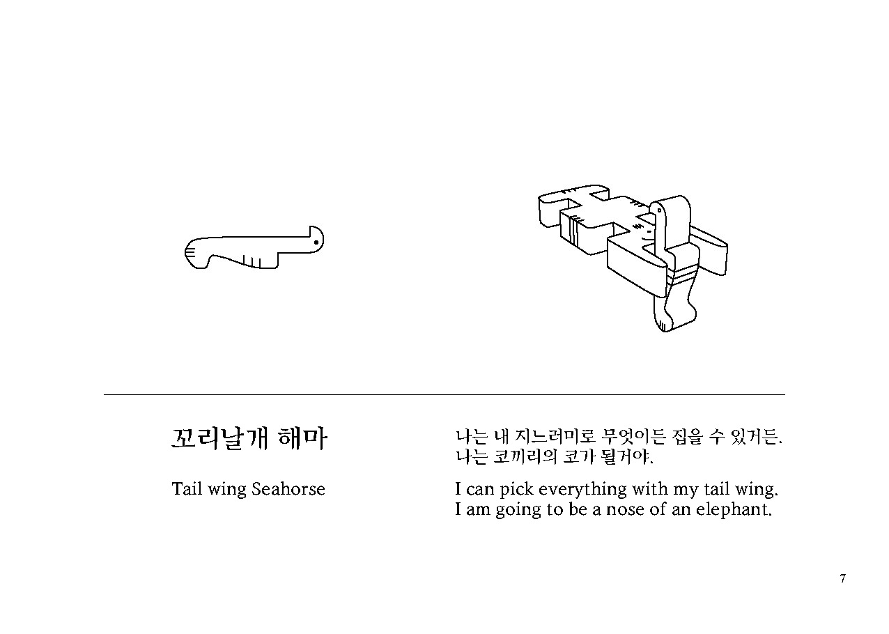 The book “The one eyed fishes to be an elephant” tells you how the fish that lived in the stomach of a whale became an elephant. Each one eyed fish takes advantage of their own characteristics and becomes part of the elephant. The ground flatfish became the elephant’s belly and ivory, the tail wing seahorse became the elephant's nose, the twinkle mackerel became the elephant's flank and face, the zigzag eel became the elephant's spine and tail, the sturdy shark became the elephant's legs, slippery mudfish became the elephant's back, the twins blowfish became the elephant's ears. The story does not end here, but ends with asking the last question "Why do the one eyed fishes want to be an elephant?" “What else could the one eyed fishes be together?” The answer is yours.