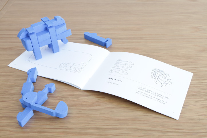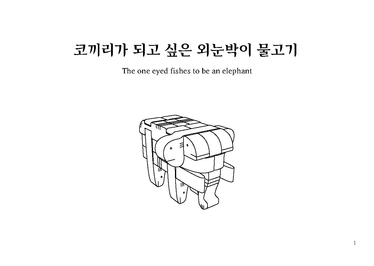 코끼리가 되고 싶은 외눈박이 물고기' 동화책은 고래 뱃속에 살던 외눈박이 물고기들이 코끼리가 되어가는 과정을 이야기합니다. 외눈박이 물고기들은 각자의 특성들을 살려서 코끼리의 일부가 됩니다. 바닥넙치는 코끼리의 배와 상아로, 꼬리날개해마는 코끼리의 코로, 푸르릉 고등어는 코끼리의 옆구리와 얼굴로, 구부렁 장어는 코끼리의 척추와 꼬리로, 코다리 상어는 코끼리의 다리로, 미끄덩 미꾸라지는 코끼리의 등으로, 쌍둥이 복어는 코끼리의 귀로 코끼리가 되어 갑니다. 동화의 마지막은 '왜 외눈박이 물고기들은 코끼리가 되었을까요?'. '외눈박이 물고기들은 또 무엇이 될 수 있을까요?' 같은 질문을 던지며 열린 결말로 이야기를 마칩니다.