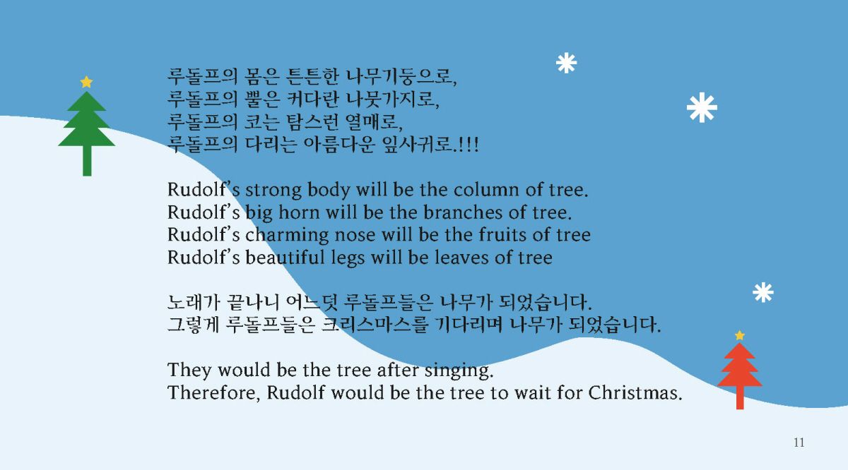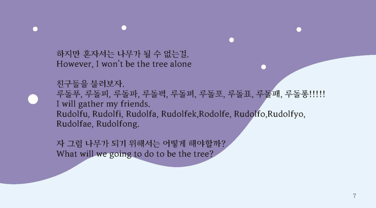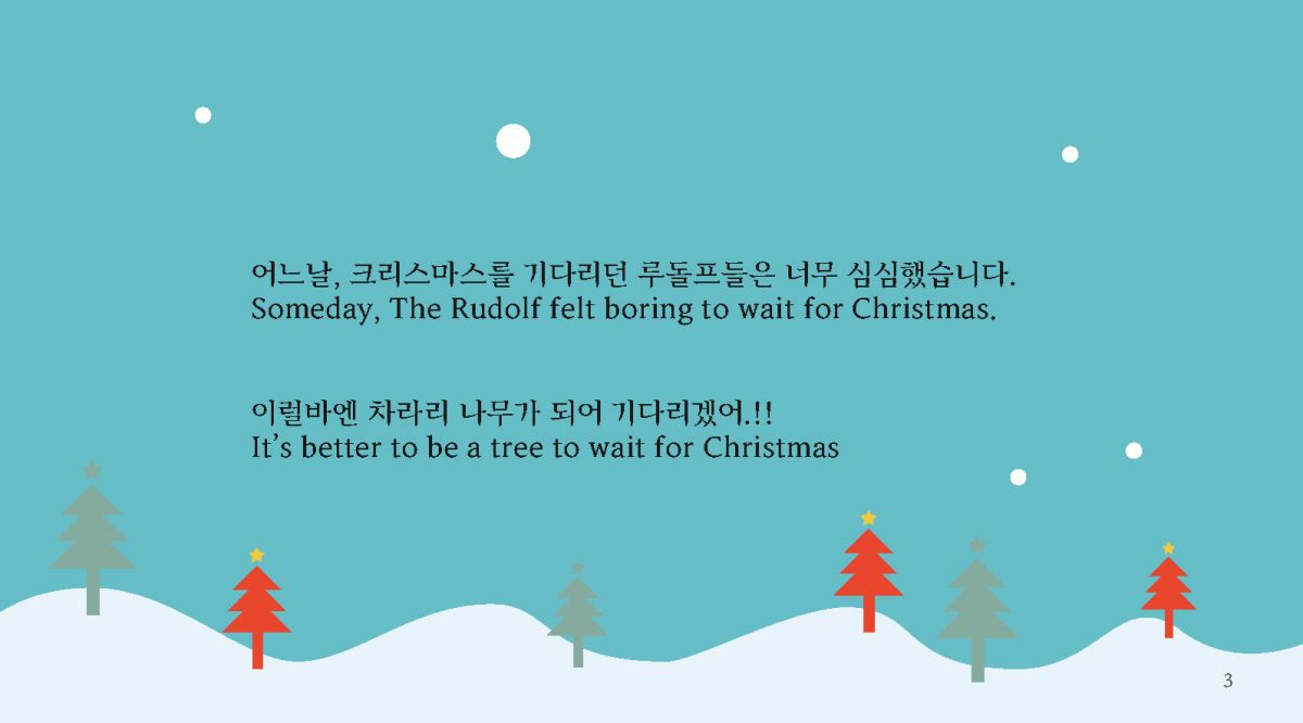 ‘크리스마스 트리가 된 루돌프’ 그림책은 크리스마스 이후의 루돌프의 숨겨진 이야기를 담았습니다. 우리는 크리스마스가 끝난 뒤 친구들, 가족들과 신나게 놀고 휴식을 취합니다. 크리스마스에 신나게 일한 루돌프는 다음 크리스마스까지 무엇을 할까요? 크리스마스를 기다리기 지루했던 루돌프는 친구들을 불러 모읍니다. 루돌프의 몸은 튼튼한 나무기둥으로, 루돌프의 뿔은 커다란 나뭇가지로, 루돌프의 코는 탐스런 열매로, 루돌프의 다리는 아름다운 잎사귀로. 루돌프는 친구들과 노래를 부르며 어느덧 나무가 되었습니다. 그렇게 루돌프들은 크리스마스를 기다리며 나무가 되었습니다. 동화의 마지막은 '왜 루돌프는 크리스마스 트리가 되었을까요?'. '루돌프들은 또 무엇이 될 수 있을까요?'라는 질문을 던지며 열린 결말로 이야기를 마칩니다.