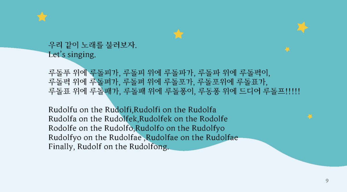 루돌푸 위에 루돌피가, 루돌피 위에 루돌파가, 루돌파 위에 루돌퍽이, 루돌퍽 위에 루돌펴가, 루돌펴 위에 루돌포가, 루돌포위에 루돌표가, 루돌표 위에 루돌패가, 루돌패 위에 루돌퐁이, 루돌퐁 위에 드디어 루돌프!!!!!