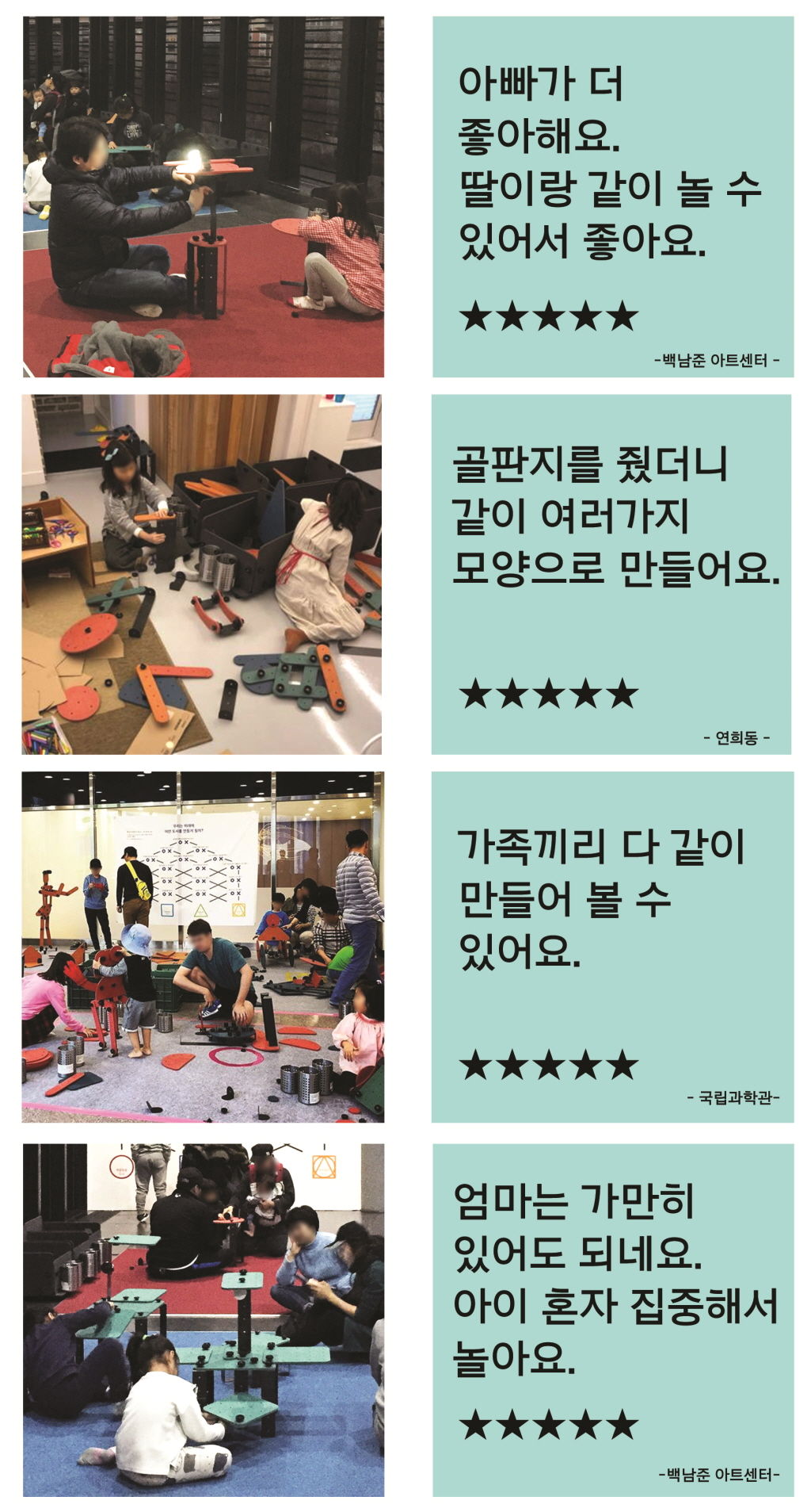 토니처는 이렇게 스스로 놀 수 있는 어른이와 아이들을 위한 창의 놀이 기구 입니다. 아이들은 장난감에 그치지 않고, 자신의 몸짓만한 오브제를 만들어 볼 수 있습니다.