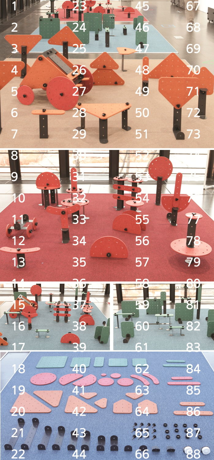 - 구성품: 레드 - 직선 2개, 곡선 1개, 작은 원 4개, 직사각형 1개, 2p 철제 1개, 꺾임 철체 1개, 3p 철제 2개, 볼트와 너트 7개 / 옐로우 - 반원 1개, 큰 원 2개, 작은 원 2개, 큰 삼각형 1개, 2p 철제 2개, 꺾임 철제 2개, 4p 철제 2개, 볼트와 너트 8개 / 그린 - 작은 삼각형 2개, 오각형 1개, 큰 원 2개, 2p 철제 4개, 3p 철제 1개, 볼트와 너트 8개