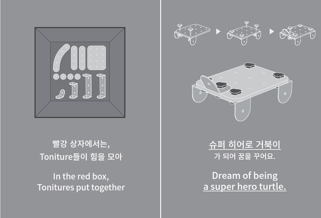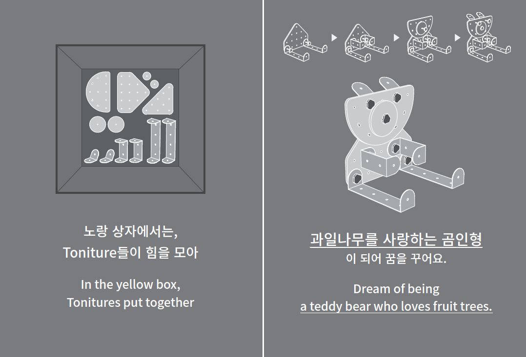 이러한 문제를 해결하여 아이들이 쉽게 질리지 않고 오래 가지고 놀 수 있으면서도 더이상 그 장난감들이 집안의 짐이 되는 것이 아닌 아이들의 작품이 될 수 있는 아트 토이를 만들고자 하였습니다. 저희가 제작한 TONITURE가 바로 그러한 생각의 결과입니다. 아이들이 질리지 않고 스스로 놀 수 있는 TOY의 역할과 짐이 아닌 하나의 오브제 역할을 하는 FUNITURE의 역할을 결합하여 오랜 시간 모두에게 소중한 기억이 될 수 있기를 바랍니다.