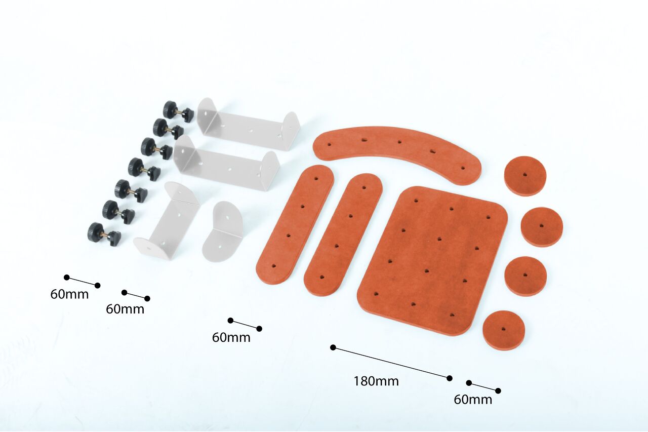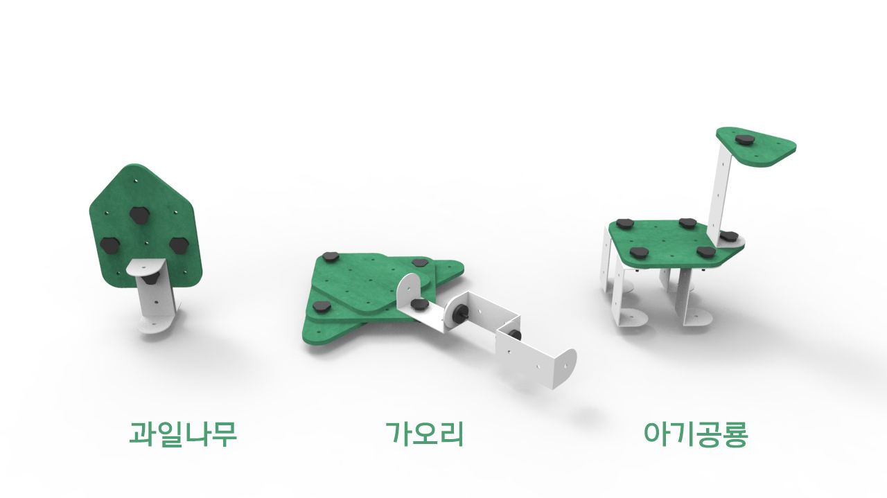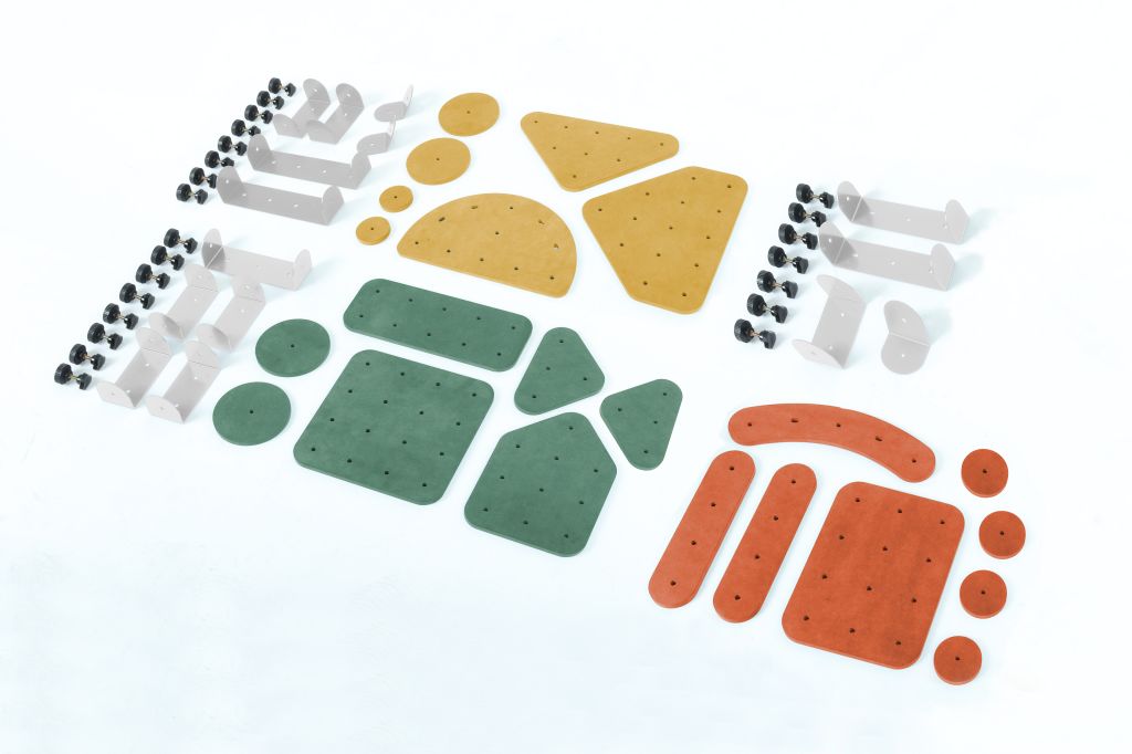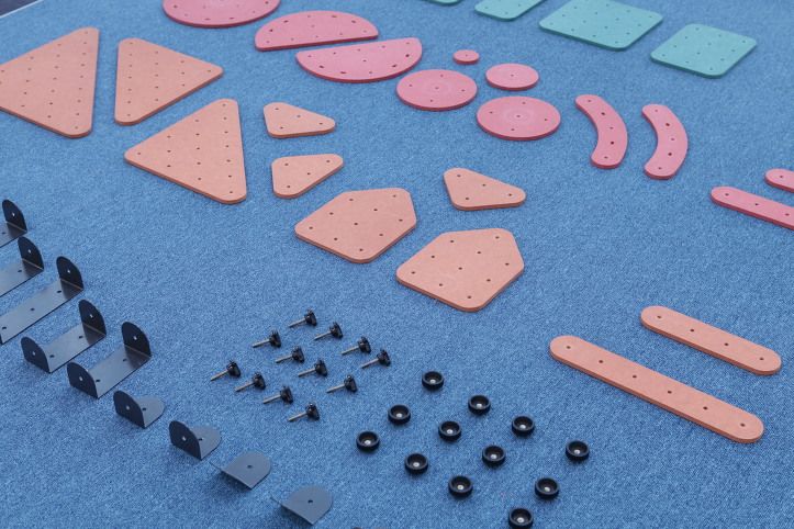 친환경 소재인 에코보드로 만들어진 다양한 모양의 보드와 철제 구조물로 구성되어 있습니다. 이 모듈들은 섬세하지 않은 아이의 손에도 적당한 크기의 노브 볼트와 너트로 제작되어 있어 조립이 간편합니다.